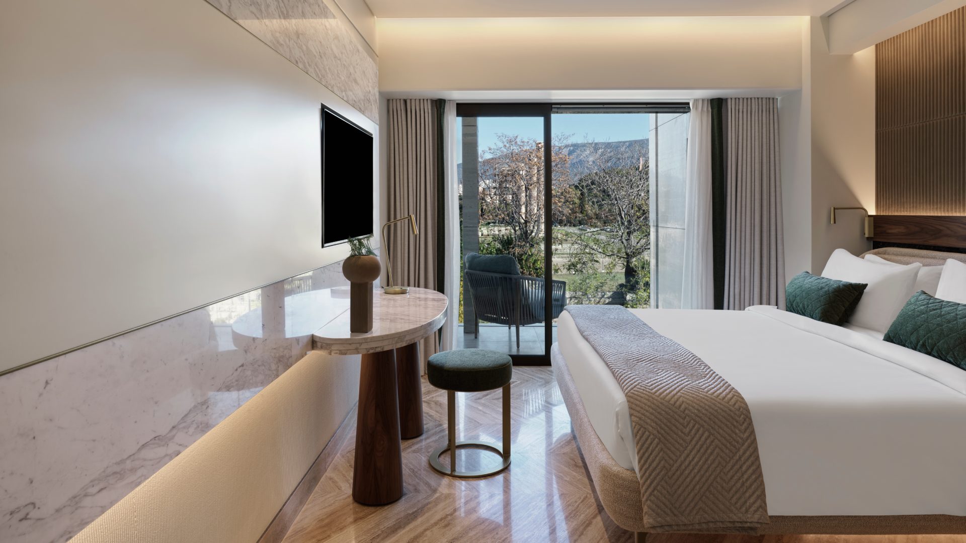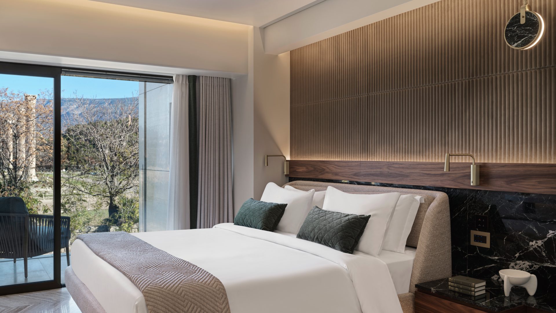 A ROOM OF QUIET ELEGANCE, OFFERING BALCONY VIEWS THAT EMBRACE THE TEMPLE OF OLYMPIAN ZEUS. THIS SPACE BALANCES POISE AND COMFORT WITH SUBTLE CHARM.