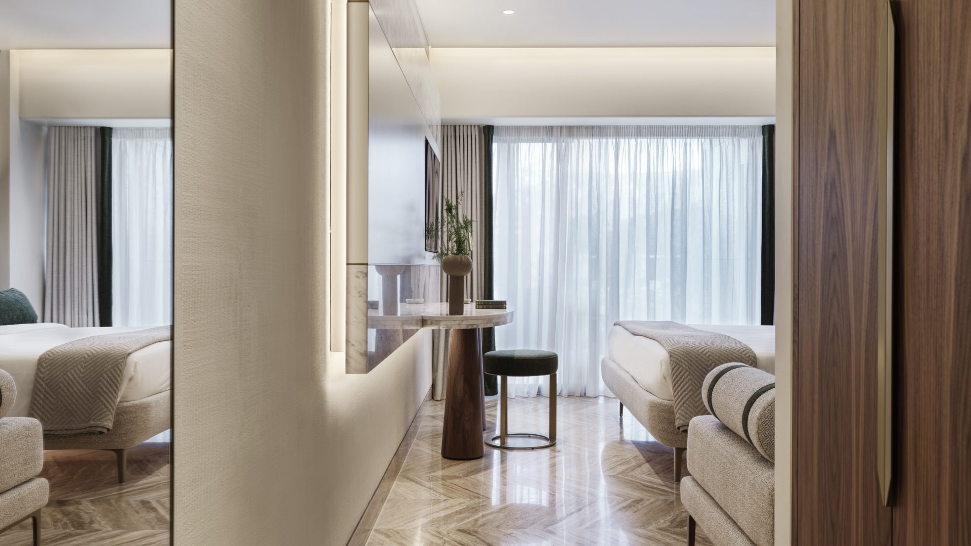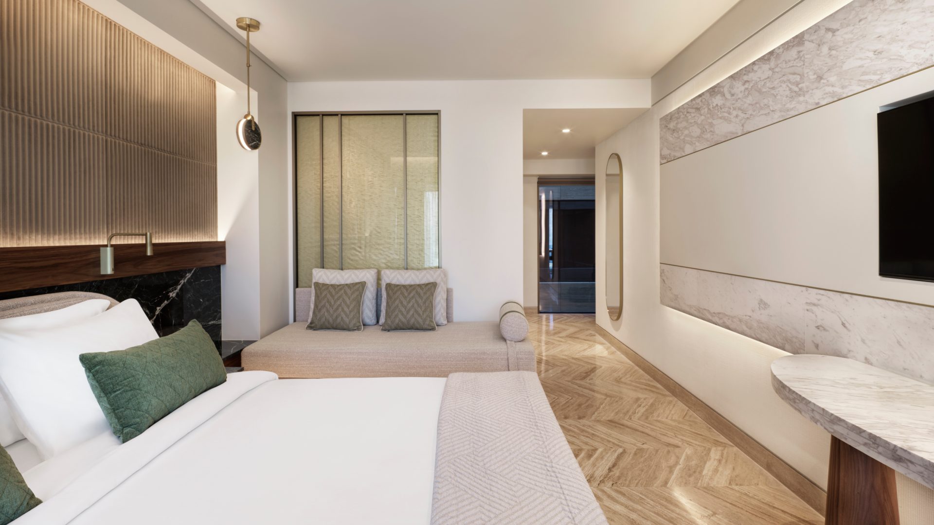 Within this serene refuge, clean lines and gentle hues create an atmosphere of understated sophistication. The timeless silhouette beyond your balcony grounds your stay in Athens’ enduring heritage, inviting restful moments infused with quiet refinement.