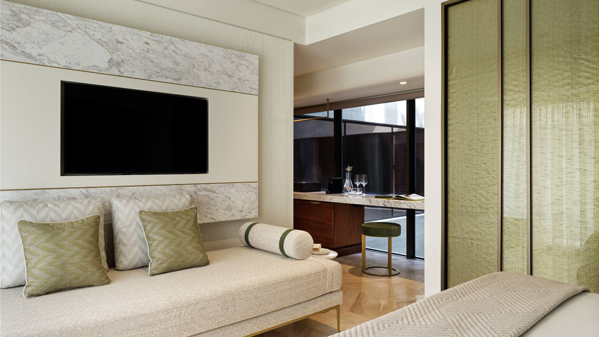 ENVELOPED IN SOFT TONES AND UNDERSTATED ELEGANCE, THIS ROOM OFFERS A PEACEFUL RETREAT WITH A PRIVATE BALCONY FACING DIONYSIOU AREOPAGITOU STREET. IT INVITES YOU TO BREATHE IN THE VIBRANT ENERGY OF ATHENS WITH CALM GRACE.