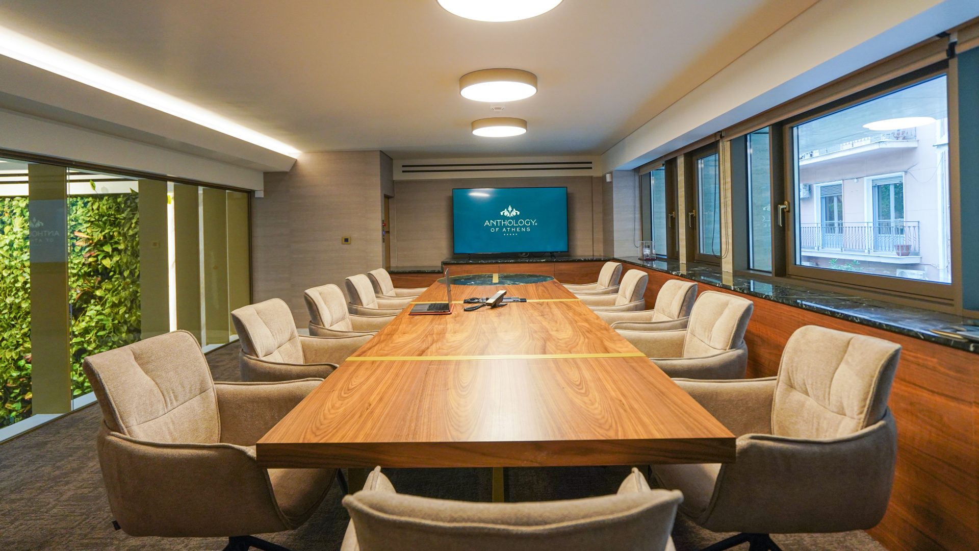 Discover Agora, our state-of-the-art meeting room where innovation meets discretion. Perfect for high-level discussions and impactful presentations. Step into the Agora Meeting Room, a space meticulously crafted to foster concentration and collaboration. Named to honour Athens' ancient forum for ideas, Agora provides an environment of refined privacy, making it the ideal setting for decision-makers, thought-leaders, and executive teams. Here, sleek, contemporary furnishings blend seamlessly with state-of-the-art technology, ensuring every presentation is delivered with clarity and every discussion is highly productive. Our attentive yet discreet service guarantees a flawless experience, allowing you to focus entirely on your objectives. Whether for crucial board meetings, dynamic workshops, or impactful presentations, Agora is where strategy flourishes, ideas find their voice, and key decisions are made with confidence, cementing success.